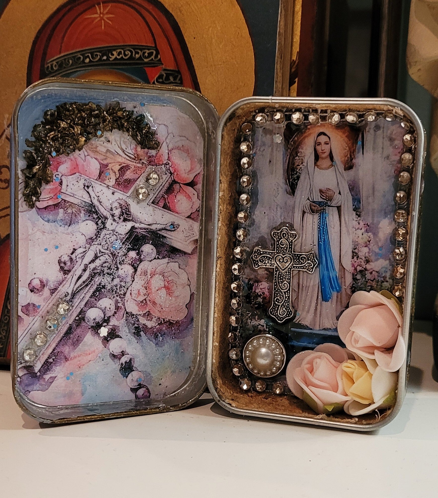Petit autel de voyage présenté dans une boîte en métal. Objet unique, décoré avec soin, idéal pour la prière ou comme objet de décoration spirituelle.