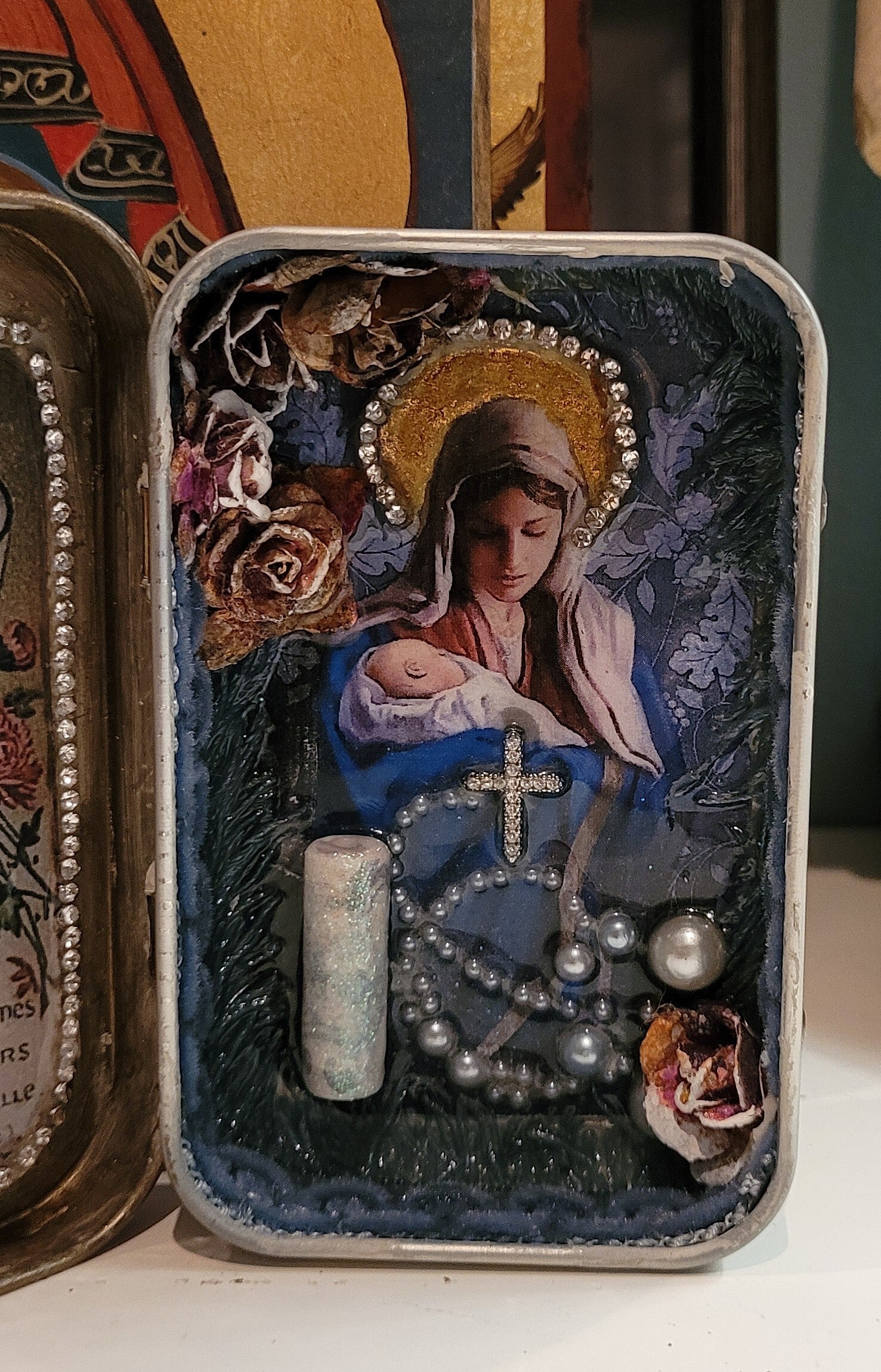 Petit autel de voyage présenté dans une boîte en métal. Objet unique, décoré avec soin, idéal pour la prière ou comme objet de décoration spirituelle.
