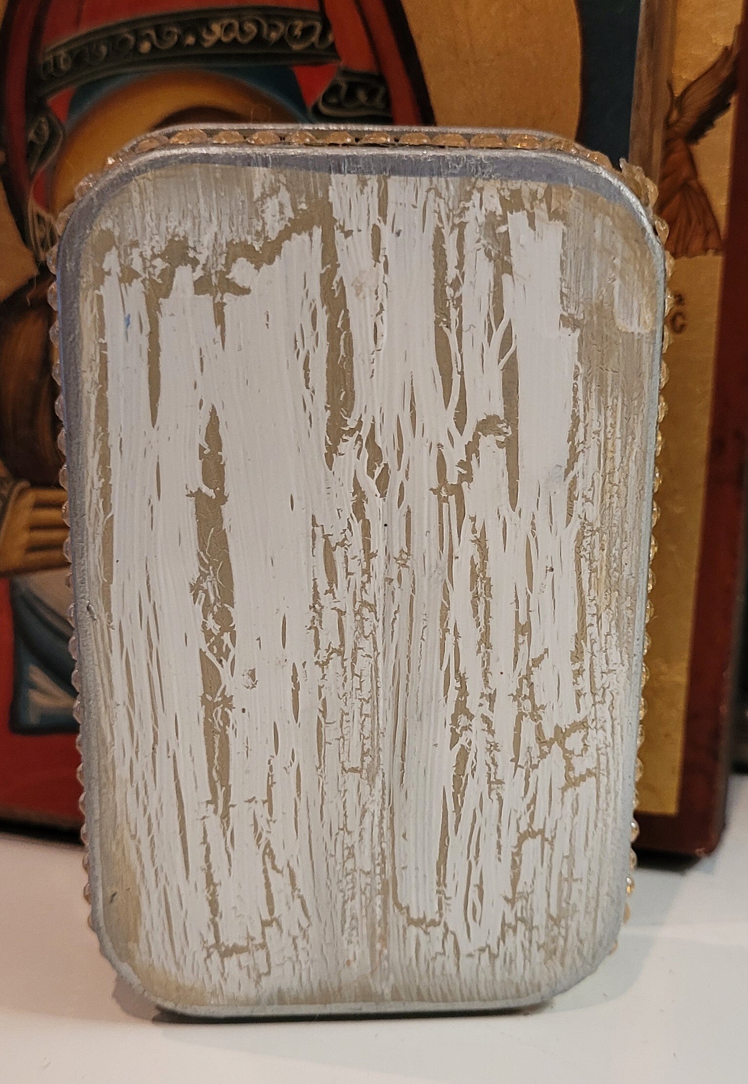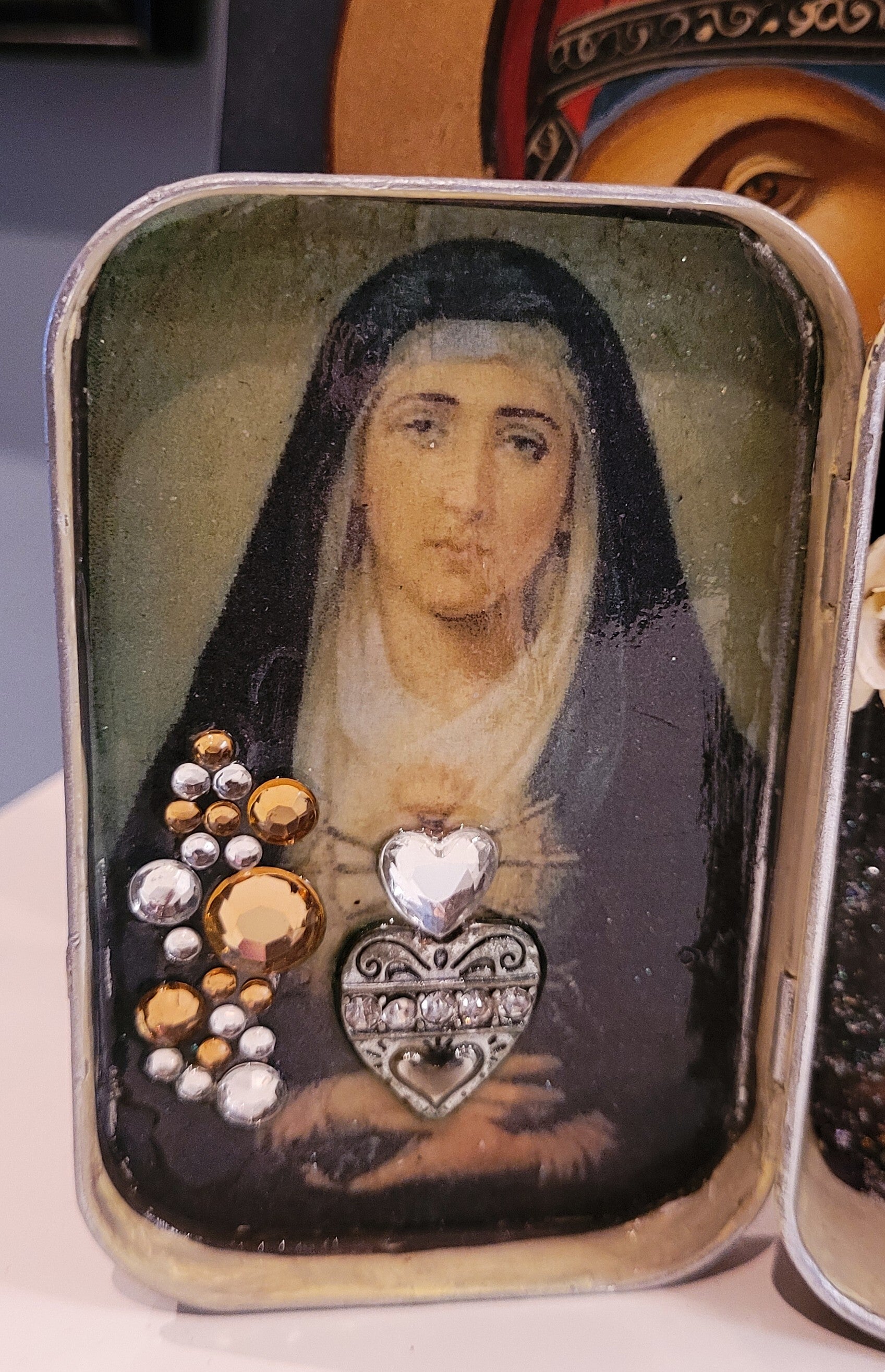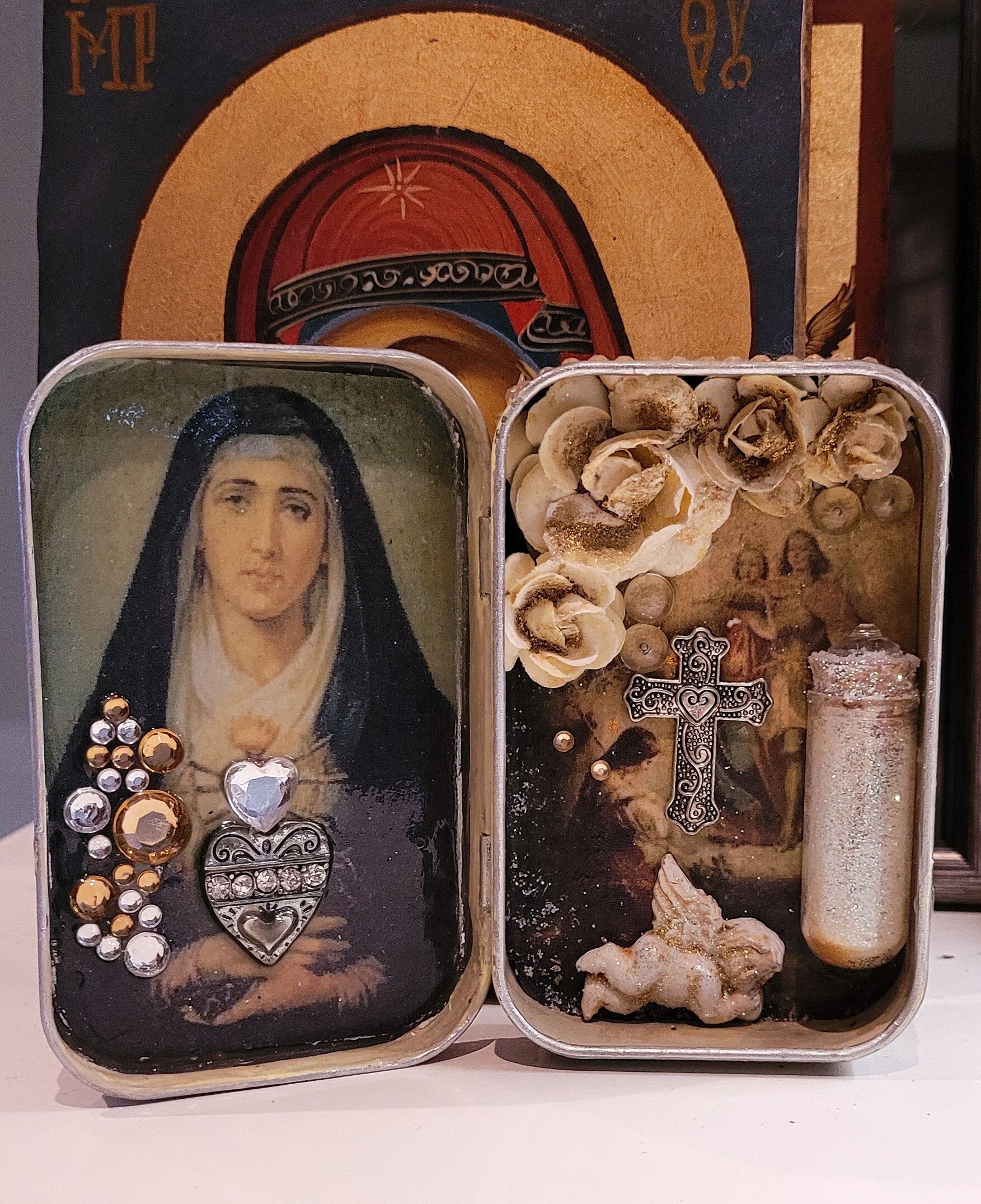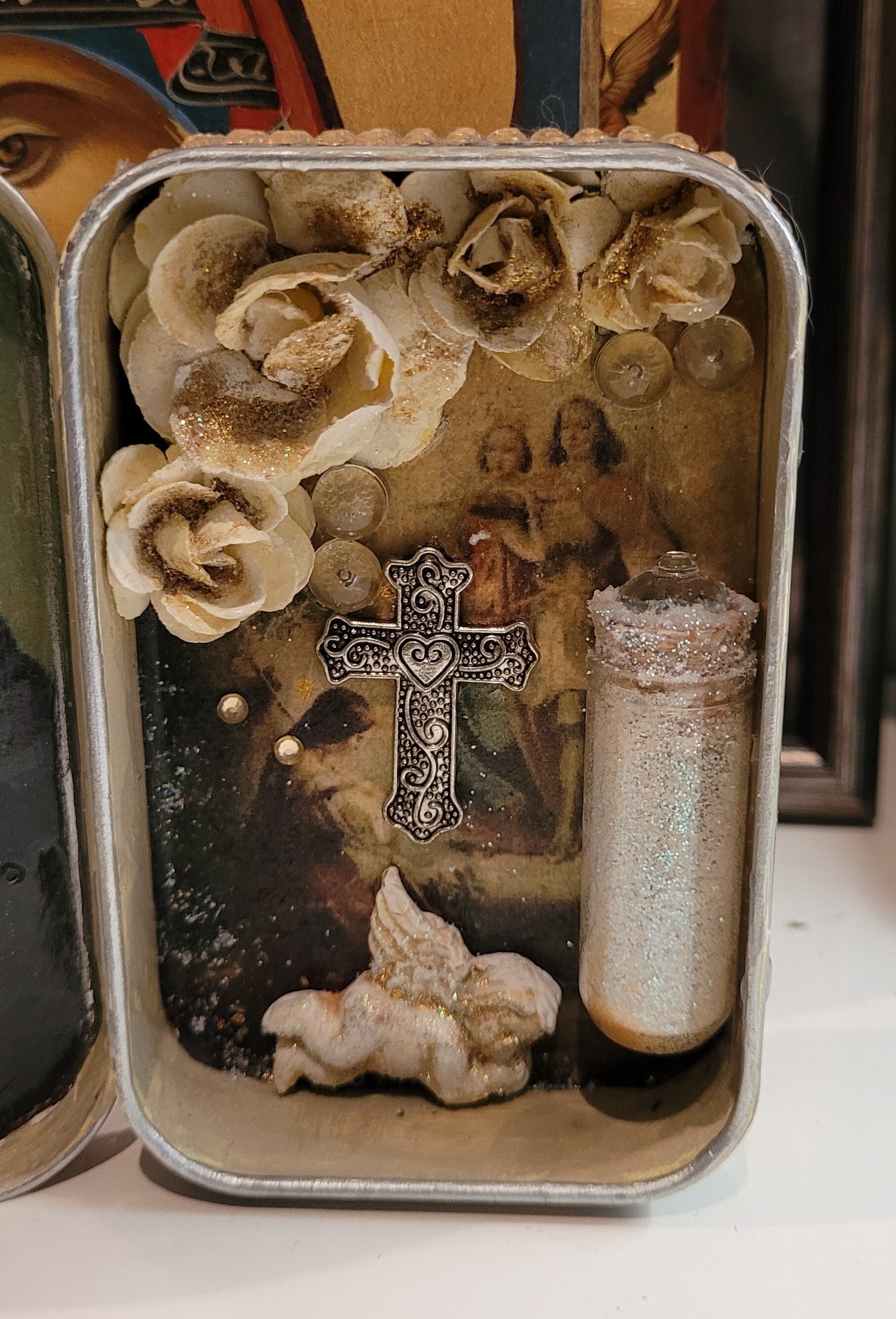 Petit autel de voyage présenté dans une boîte en métal. Objet unique, décoré avec soin, idéal pour la prière ou comme objet de décoration spirituelle.